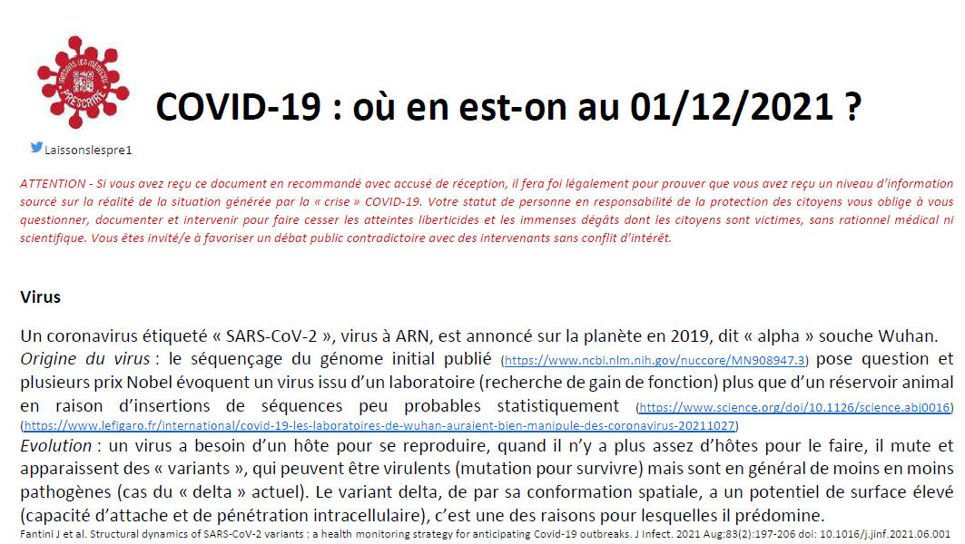 A Retenir D’après le réseau Sentinelles en semaine 50 de 2021 le nombre de malades de la Covid était estimé à 39/100 000 habitants. Ce chiffre ne justifie pas une quasi obligation vaccinale sous-forme de pass vaccinal. De nombreuses publications montrent l’échappement du variant Omicron aux vaccins Les vaccinés et les primo-infectés sont plus à risque d’être porteurs […]